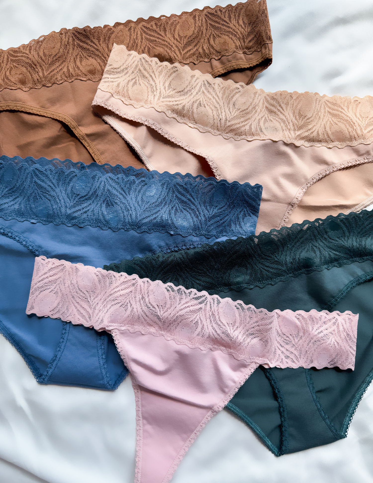Breathable bamboo cotton, an absorbent, leak-resistant gusset, and a stay-put lace waistband.