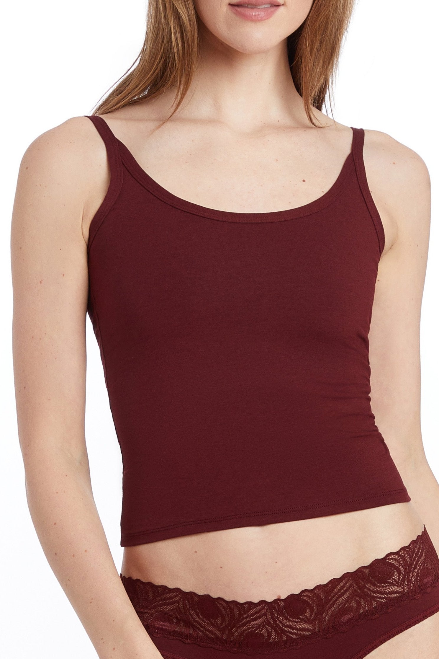 Works as a base layer or standalone piece; deep back scoop and snug fit