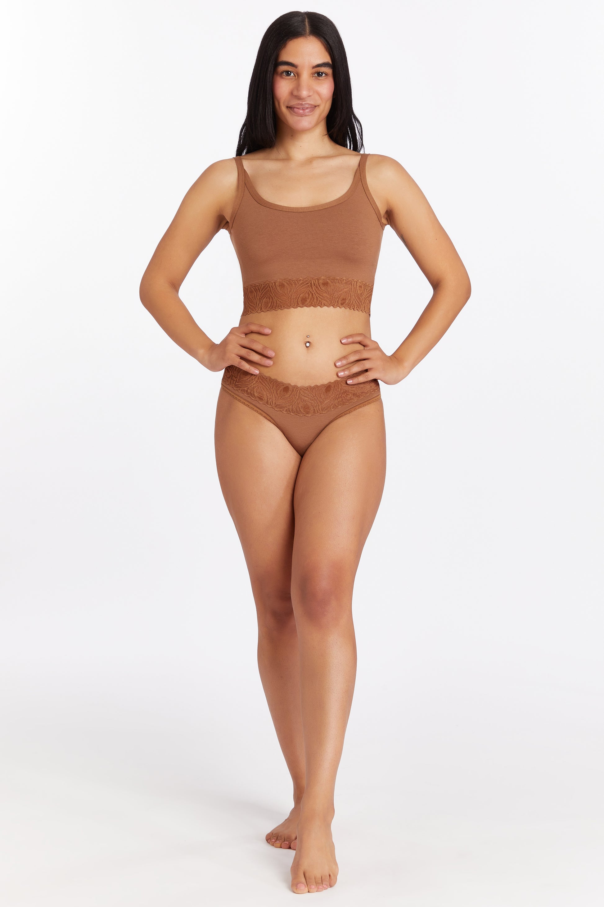 Features a PFOA free, leak-proof, built-in panty liner that smooths cameltoe